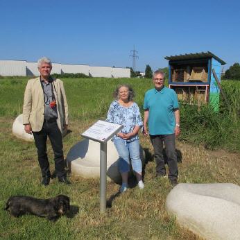 „Bei der Hinweistafel ist es aber nicht geblieben“, teilt Krämer weiter mit. Engagiert für die Station auf der Regionalparkroute haben sich auch die Städtischen Betriebe. So wurde der Platz mit sogenannten Sitzkieseln und einem großen Insektenhotel wesentlich aufgewertet. „Die Sitzkiesel sind nicht nur zum Hinsetzen gedacht, sondern auch als Spielgelegenheit für Kinder, die mit ihren Eltern auf Tour sind“, sagt Michael Würz, Technischer Leiter der Städtischen Betriebe, der die Idee eines Hinweises auf den Breitengrad von Anfang an unterstützt hat. Beteiligt hatten sich ebenso vor allem Bernd Gerhard, Bereichsleiter Städtische Betriebe und Stefan Rogge, Abteilungsleiter Grünflächenbewirtschaftung. „Ihnen gebührt ein herzlicher Dank, ohne ihre Hilfe hätten wir das Projekt nicht realisieren können“, stellt Otto Krämer fest.