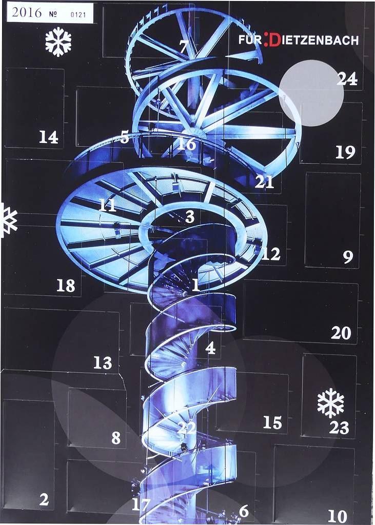 Mehr als 600 Preise im Wert von rund 12000 Euro. Wieder einmal besticht der Adventskalender des Vereins "Für :Dietzenbach", nunmehr der siebte, auch im zehnten Jahr nach Vereinsgründung mit beeindruckenden Zahlen. Dazu ist er außen mit einer schönen Ansicht des Turms auf dem Wingertsberg, aufgenommen von dem Fotografen Sascha Dreger, stimmungsvoll geschmückt.