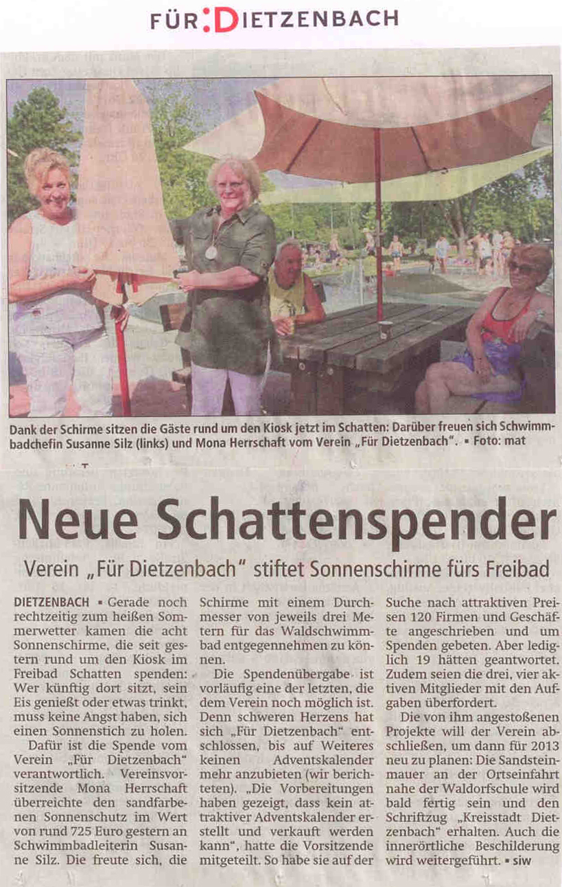 | Offenbach Post 22.08.2012 | Sonnenschirme fürs Schwimmbad | Weiterlesen... |